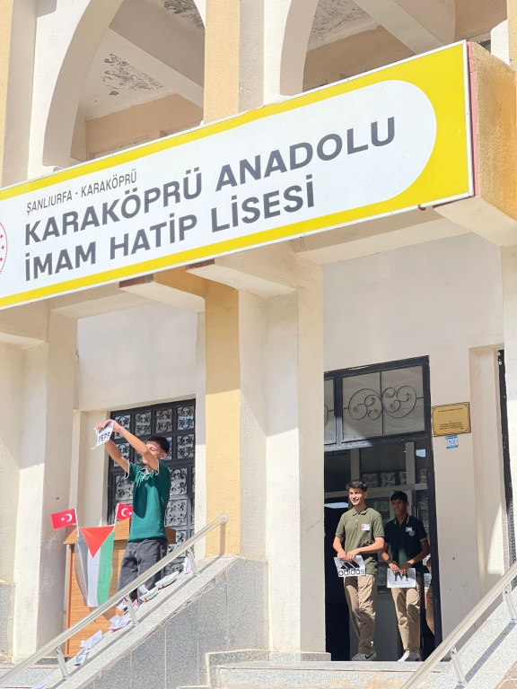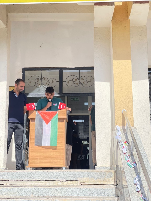 Öğrencilerimiz, okul bahçesinde bir araya gelerek Türk ve Filistin bayrakları taşıdılar ve çeşitli sloganlar eşliğinde tepkilerini dile getirdiler.